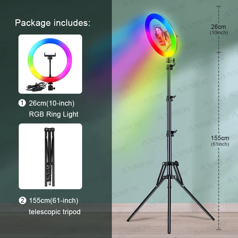 -- Product model: 26cm(10inch) Ring Light with 155cm(61.02inch) Telescopic Tripod