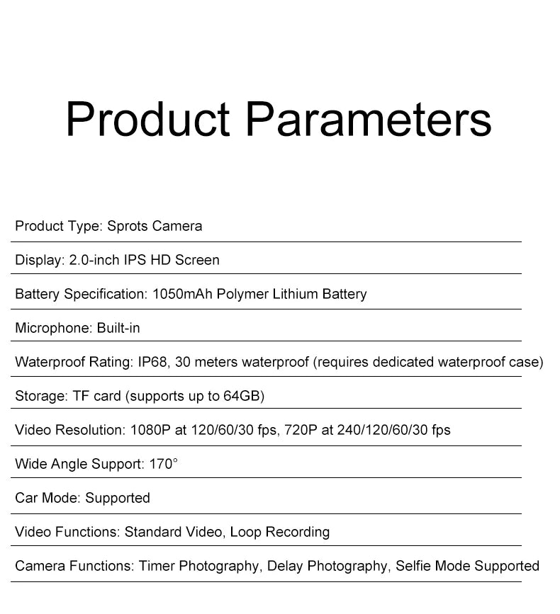Packing list: 1 * camera, 1 * waterproof box, 1 * adapter screw, 1 * adapter bracket, 1 * strap, 1 * sticky board, 1 * charging cable, 1 * bicycle bracket, 1 * middle frame, 1 * Instructions