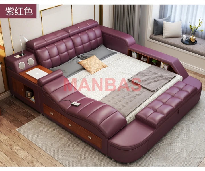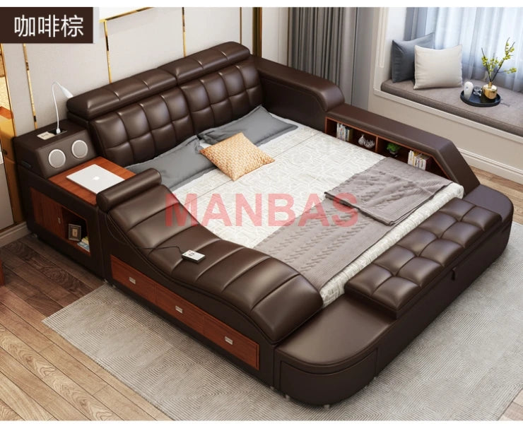 King/Queen Size Multifunctional Bed Tech Smart Beds Ultimate Camas TATAMI Massage Lit Genuine Leather Upholstered Bed with Audio
