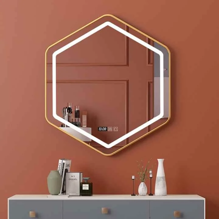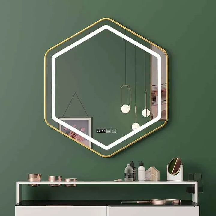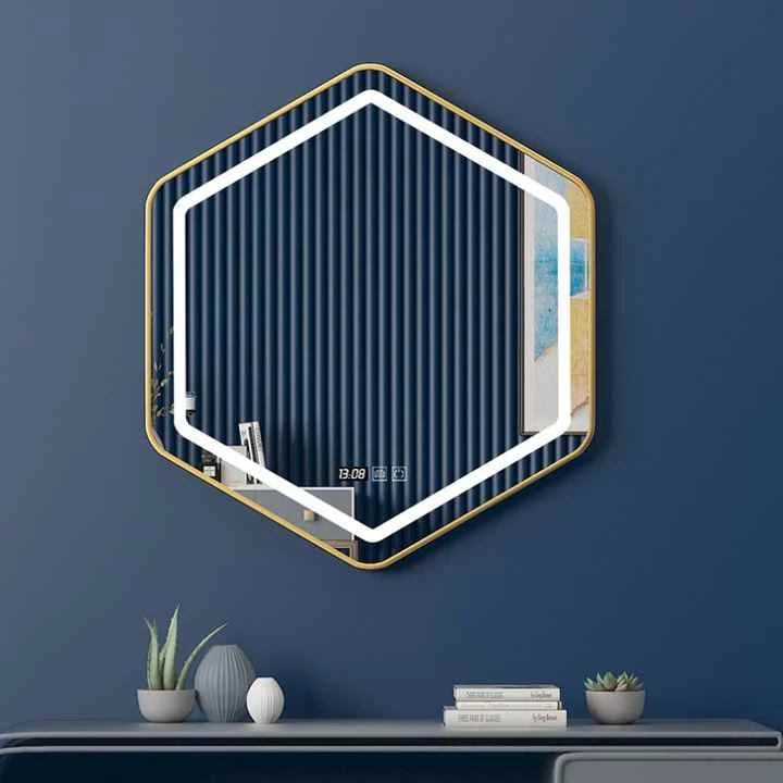 Wholesale Modern Luxury Custom Hexagon Stainless Steel Frame Wall Hanging LED Light Shower Touch Screen Bathroom Smart Mirrors
