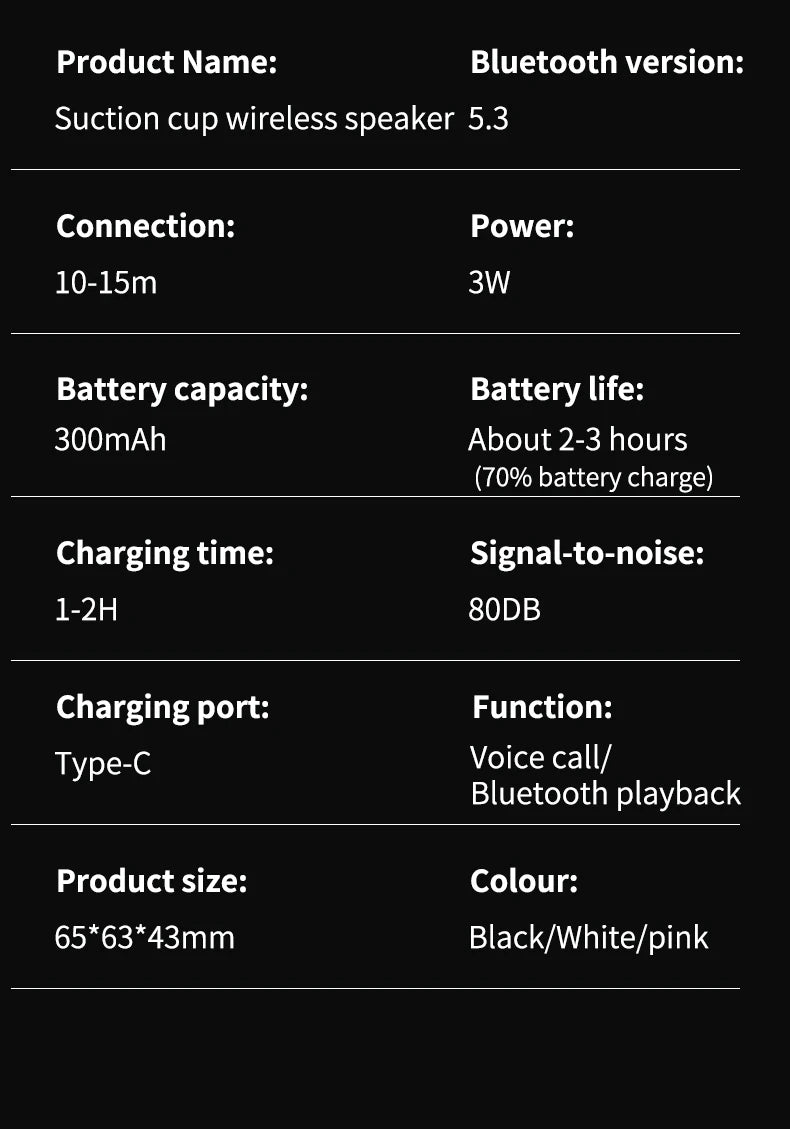 This product combines a wireless suction cup, phone mount, and convenient call functionality into one. The durable suction cup provides stable adhesion for use anytime, anywhere. It supports up to 3 hours of continuous playback to meet daily entertainment and mobile needs, and features a one-touch answer button for simpler, more efficient call handling. It balances practicality with artistic design.