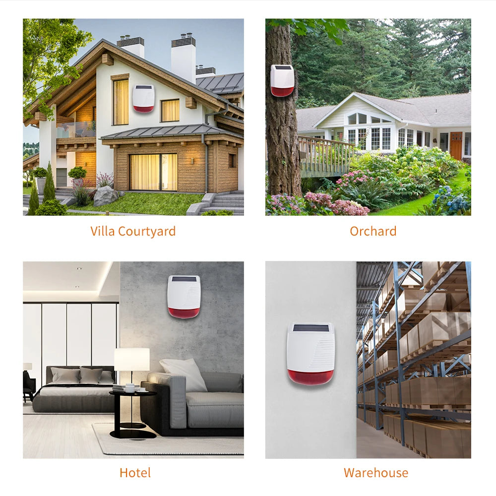 The wireless outdoor solar siren sounds about 110dB sound, with flash, high quality and durable.