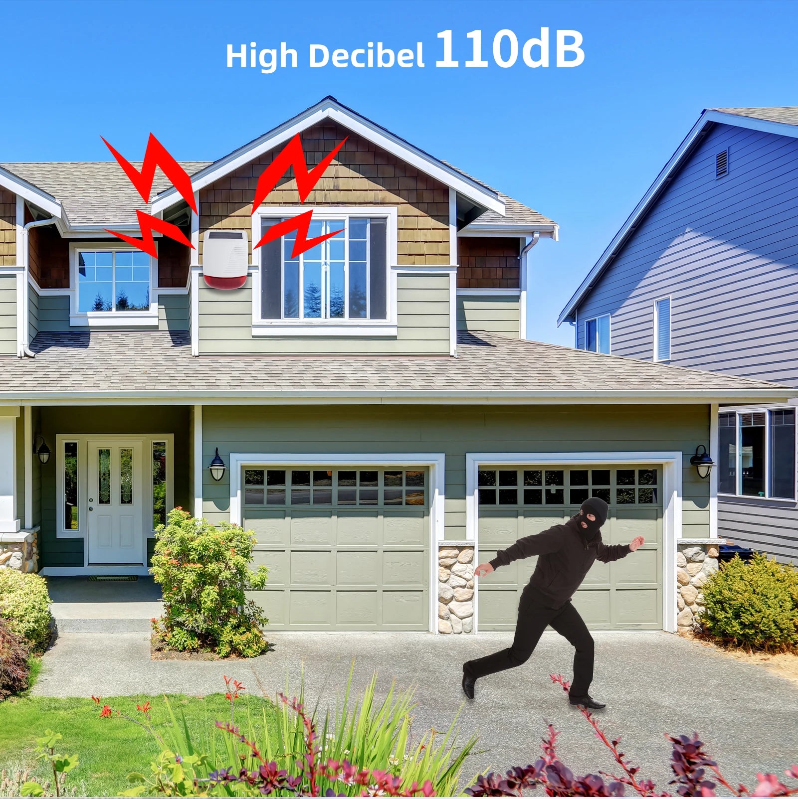 In the event of an intrusion, the alarm system will send an RF signal to it, and the alarm will emit a high-decibel sound to block the intruder.